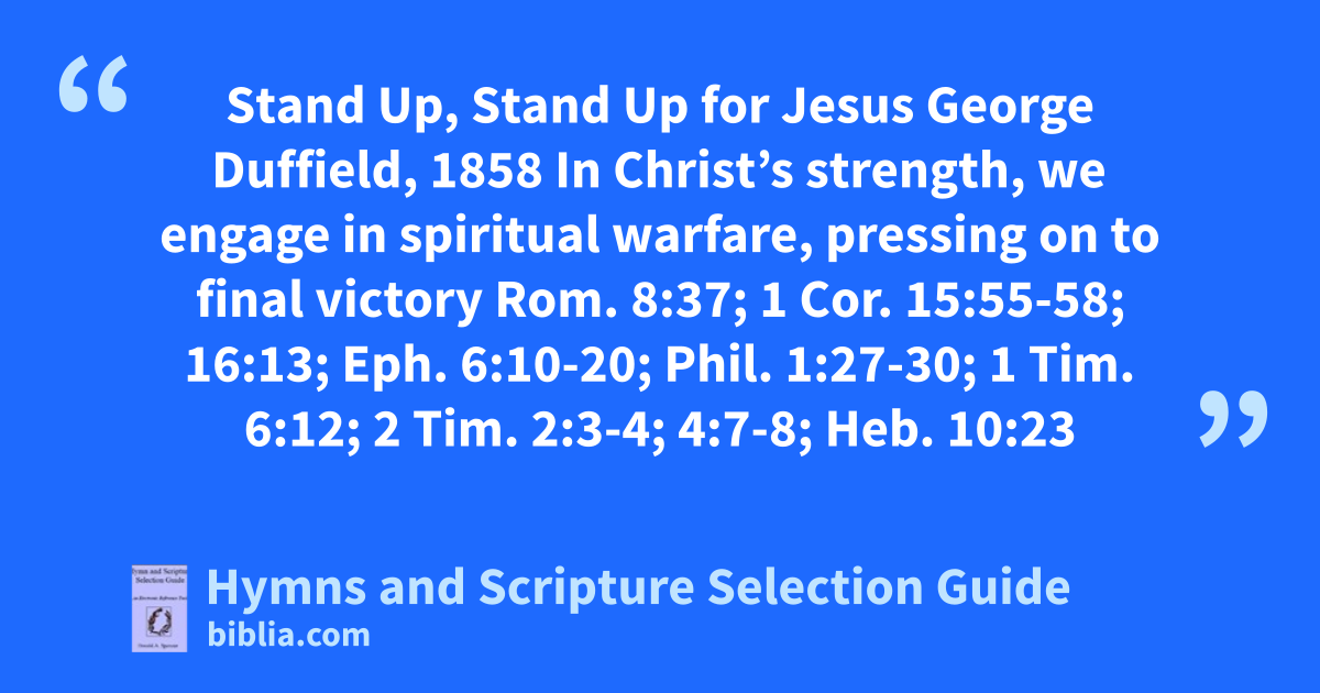 Stand Up, Stand Up for Jesus George Duffield, 1858 In Christ’s strength, we engage in spiritual warfare, pressing on to final victory Rom. 8:37; 1 Cor. 15:55-58; 16:13; Eph. 6:10-20; Phil. 1:27-30; 1 Tim. 6:12; 2 Tim. 2:3-4; 4:7-8; Heb. 10:23