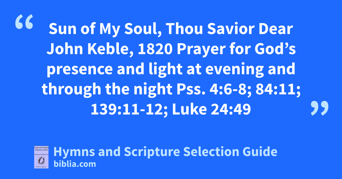 Sun of My Soul, Thou Savior Dear John Keble, 1820 Prayer for God’s presence and light at evening and through the night Pss. 4:6-8; 84:11; 139:11-12; Luke 24:49
