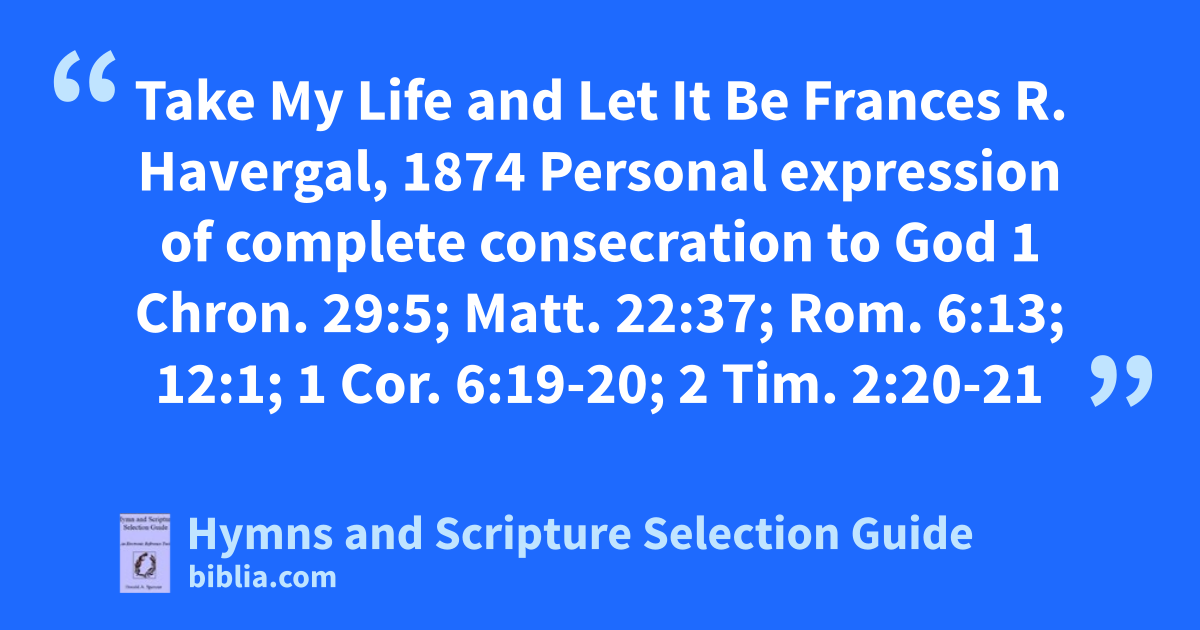 Take My Life and Let It Be Frances R. Havergal, 1874 Personal expression of complete consecration to God 1 Chron. 29:5; Matt. 22:37; Rom. 6:13; 12:1; 1 Cor. 6:19-20; 2 Tim. 2:20-21