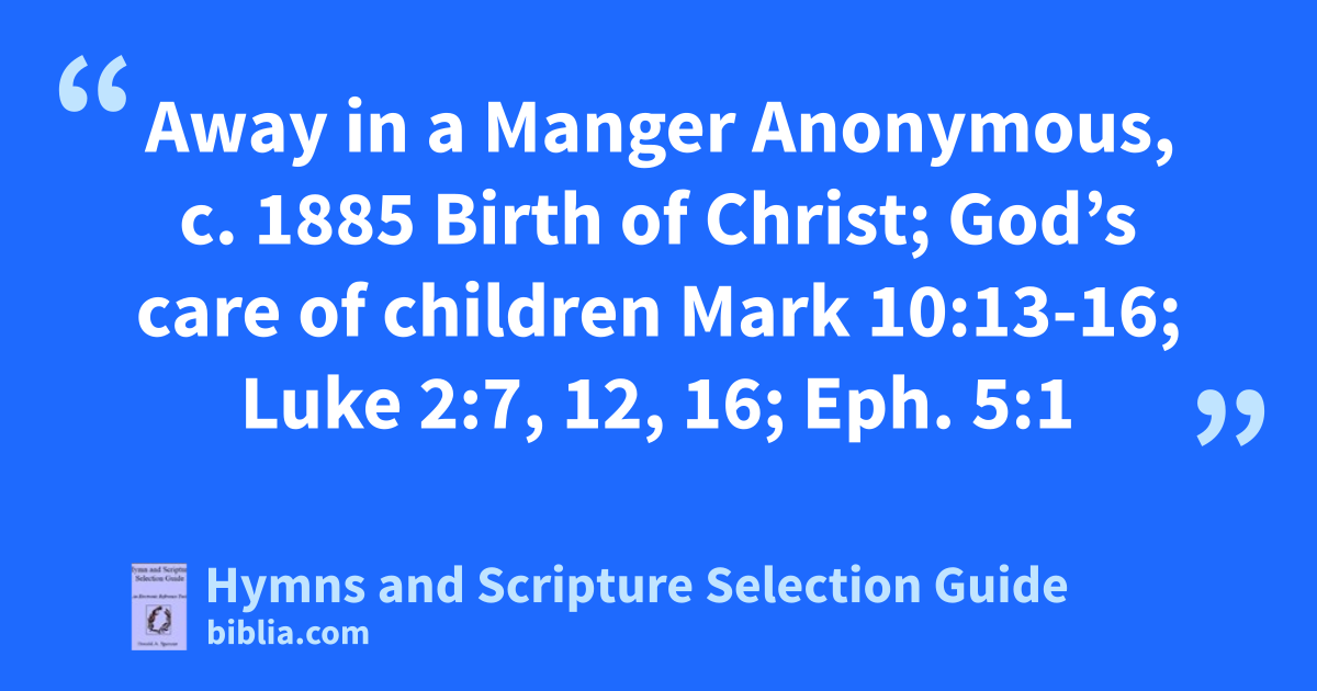 Away in a Manger Anonymous, c. 1885 Birth of Christ; God’s care of children Mark 10:13-16; Luke 2:7, 12, 16; Eph. 5:1