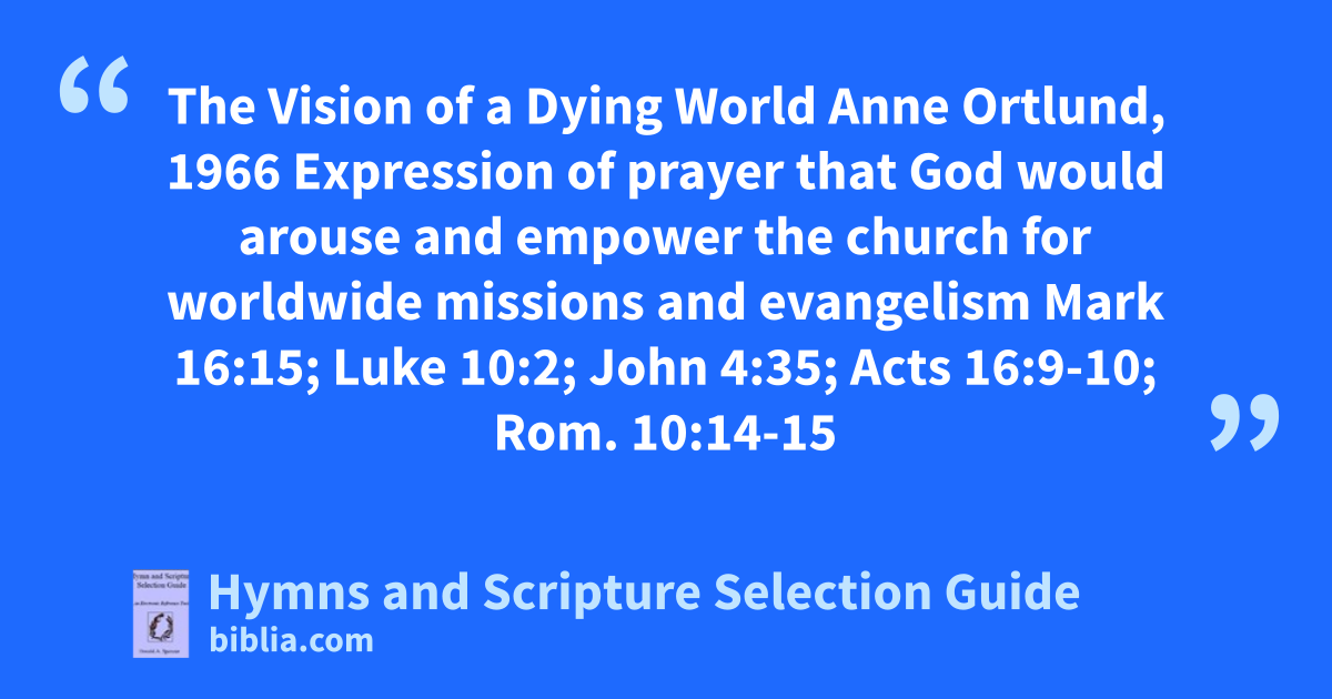 The Vision of a Dying World Anne Ortlund, 1966 Expression of prayer that God would arouse and empower the church for worldwide missions and evangelism Mark 16:15; Luke 10:2; John 4:35; Acts 16:9-10; Rom. 10:14-15
