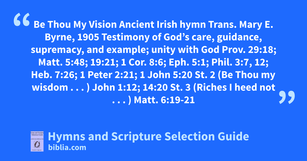Be Thou My Vision Ancient Irish hymn Trans. Mary E. Byrne, 1905 Testimony of God’s care, guidance, supremacy, and example; unity with God Prov. 29:18; Matt. 5:48; 19:21; 1 Cor. 8:6; Eph. 5:1; Phil. 3:7, 12; Heb. 7:26; 1 Peter 2:21; 1 John 5:20 St. 2 (Be Thou my wisdom . . . ) John 1:12; 14:20 St. 3 (Riches I heed not . . . ) Matt. 6:19-21