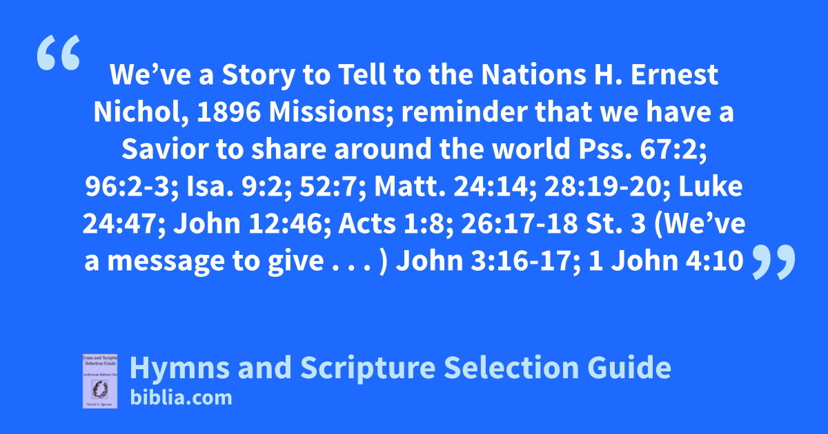 We’ve a Story to Tell to the Nations H. Ernest Nichol, 1896 Missions; reminder that we have a Savior to share around the world Pss. 67:2; 96:2-3; Isa. 9:2; 52:7; Matt. 24:14; 28:19-20; Luke 24:47; John 12:46; Acts 1:8; 26:17-18 St. 3 (We’ve a message to give . . . ) John 3:16-17; 1 John 4:10