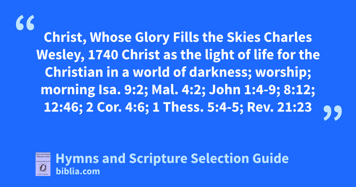 Christ, Whose Glory Fills the Skies Charles Wesley, 1740 Christ as the light of life for the Christian in a world of darkness; worship; morning Isa. 9:2; Mal. 4:2; John 1:4-9; 8:12; 12:46; 2 Cor. 4:6; 1 Thess. 5:4-5; Rev. 21:23