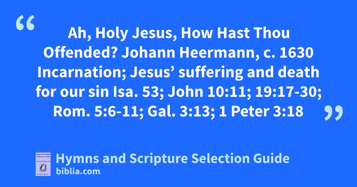 Ah, Holy Jesus, How Hast Thou Offended? Johann Heermann, c. 1630 Incarnation; Jesus’ suffering and death for our sin Isa. 53; John 10:11; 19:17-30; Rom. 5:6-11; Gal. 3:13; 1 Peter 3:18
