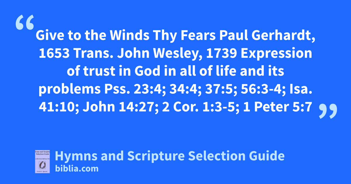 Give to the Winds Thy Fears Paul Gerhardt, 1653 Trans. John Wesley, 1739 Expression of trust in God in all of life and its problems Pss. 23:4; 34:4; 37:5; 56:3-4; Isa. 41:10; John 14:27; 2 Cor. 1:3-5; 1 Peter 5:7