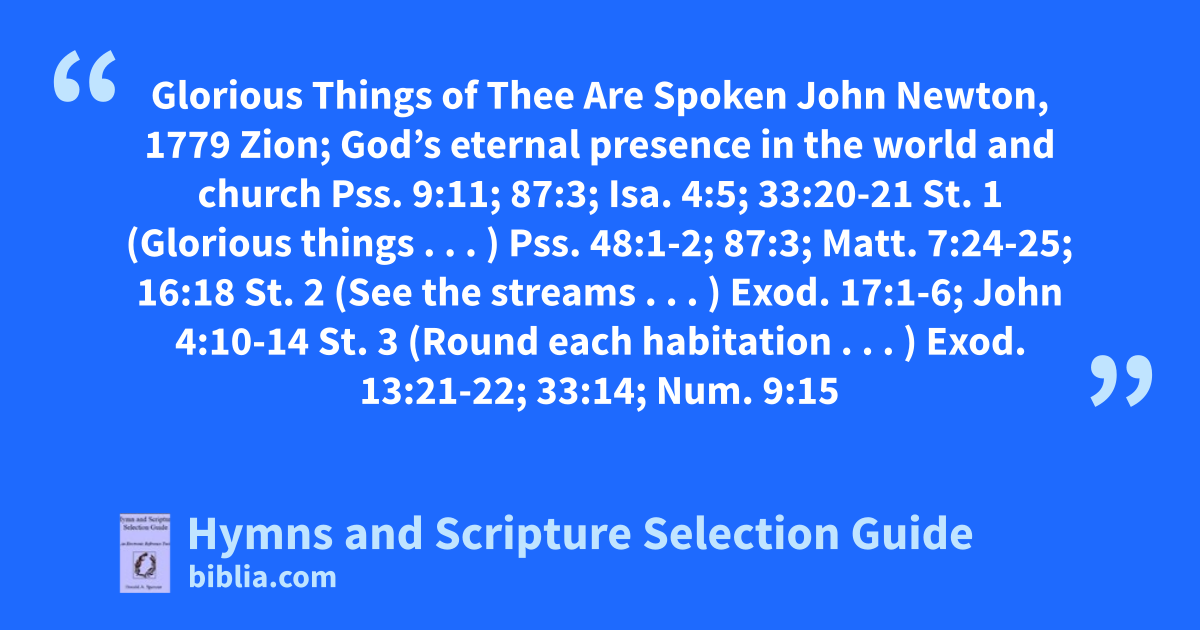Glorious Things of Thee Are Spoken John Newton, 1779 Zion; God’s eternal presence in the world and church Pss. 9:11; 87:3; Isa. 4:5; 33:20-21 St. 1 (Glorious things . . . ) Pss. 48:1-2; 87:3; Matt. 7:24-25; 16:18 St. 2 (See the streams . . . ) Exod. 17:1-6; John 4:10-14 St. 3 (Round each habitation . . . ) Exod. 13:21-22; 33:14; Num. 9:15