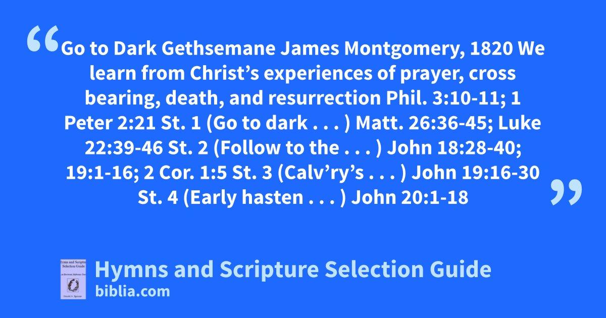 Go to Dark Gethsemane James Montgomery, 1820 We learn from Christ’s experiences of prayer, cross bearing, death, and resurrection Phil. 3:10-11; 1 Peter 2:21 St. 1 (Go to dark . . . ) Matt. 26:36-45; Luke 22:39-46 St. 2 (Follow to the . . . ) John 18:28-40; 19:1-16; 2 Cor. 1:5 St. 3 (Calv’ry’s . . . ) John 19:16-30 St. 4 (Early hasten . . . ) John 20:1-18