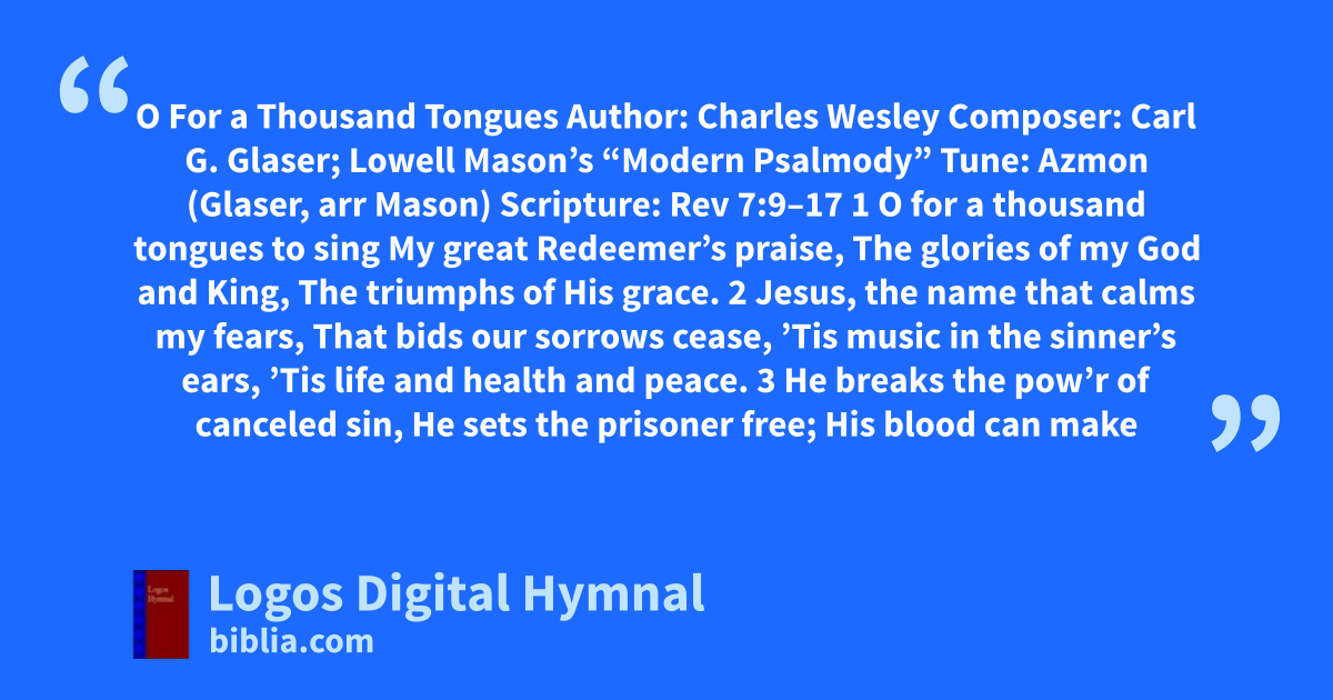 O For a Thousand Tongues Author: Charles Wesley Composer: Carl G. Glaser; Lowell Mason’s “Modern Psalmody” Tune: Azmon (Glaser, arr Mason) Scripture: Rev 7:9–17 1 O for a thousand tongues to sing My great Redeemer’s praise, The glories of my God and King, The triumphs of His grace. 2 Jesus, the name that calms my fears, That bids our sorrows cease, ’Tis music in the sinner’s ears, ’Tis life and health and peace. 3 He breaks the pow’r of canceled sin, He sets the prisoner free; His blood can make