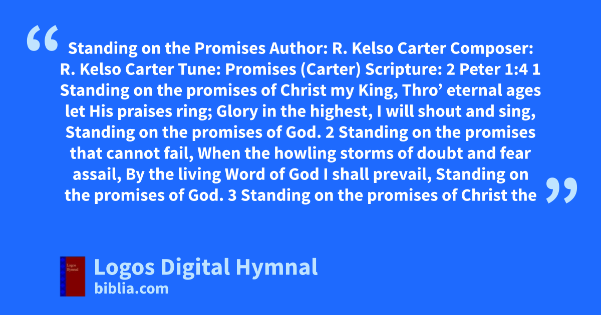 Standing on the Promises Author: R. Kelso Carter Composer: R. Kelso Carter Tune: Promises (Carter) Scripture: 2 Peter 1:4 1 Standing on the promises of Christ my King, Thro’ eternal ages let His praises ring; Glory in the highest, I will shout and sing, Standing on the promises of God. 2 Standing on the promises that cannot fail, When the howling storms of doubt and fear assail, By the living Word of God I shall prevail, Standing on the promises of God. 3 Standing on the promises of Christ the