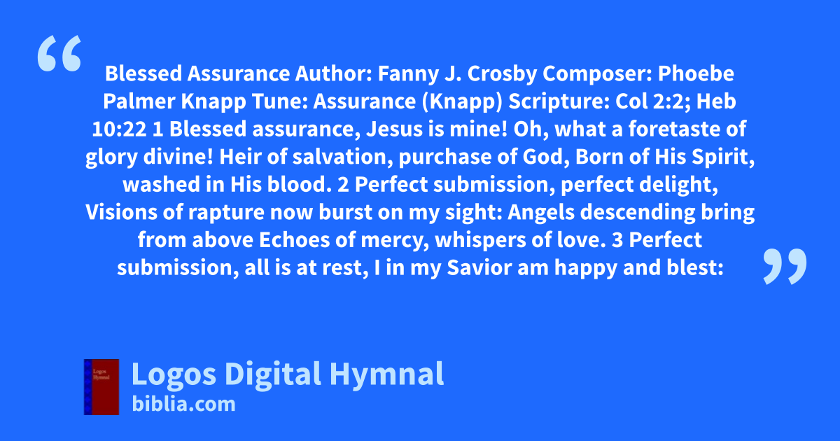Blessed Assurance Author: Fanny J. Crosby Composer: Phoebe Palmer Knapp Tune: Assurance (Knapp) Scripture: Col 2:2; Heb 10:22 1 Blessed assurance, Jesus is mine! Oh, what a foretaste of glory divine! Heir of salvation, purchase of God, Born of His Spirit, washed in His blood. 2 Perfect submission, perfect delight, Visions of rapture now burst on my sight: Angels descending bring from above Echoes of mercy, whispers of love. 3 Perfect submission, all is at rest, I in my Savior am happy and blest: