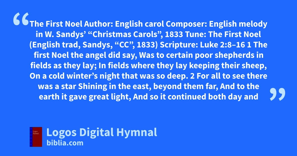The First Noel Author: English carol Composer: English melody in W. Sandys’ “Christmas Carols”, 1833 Tune: The First Noel (English trad, Sandys, “CC”, 1833) Scripture: Luke 2:8–16 1 The first Noel the angel did say, Was to certain poor shepherds in fields as they lay; In fields where they lay keeping their sheep, On a cold winter’s night that was so deep. 2 For all to see there was a star Shining in the east, beyond them far, And to the earth it gave great light, And so it continued both day and