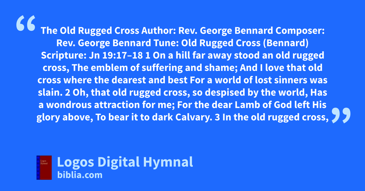The Old Rugged Cross Author: Rev. George Bennard Composer: Rev. George Bennard Tune: Old Rugged Cross (Bennard) Scripture: Jn 19:17–18 1 On a hill far away stood an old rugged cross, The emblem of suffering and shame; And I love that old cross where the dearest and best For a world of lost sinners was slain. 2 Oh, that old rugged cross, so despised by the world, Has a wondrous attraction for me; For the dear Lamb of God left His glory above, To bear it to dark Calvary. 3 In the old rugged cross,