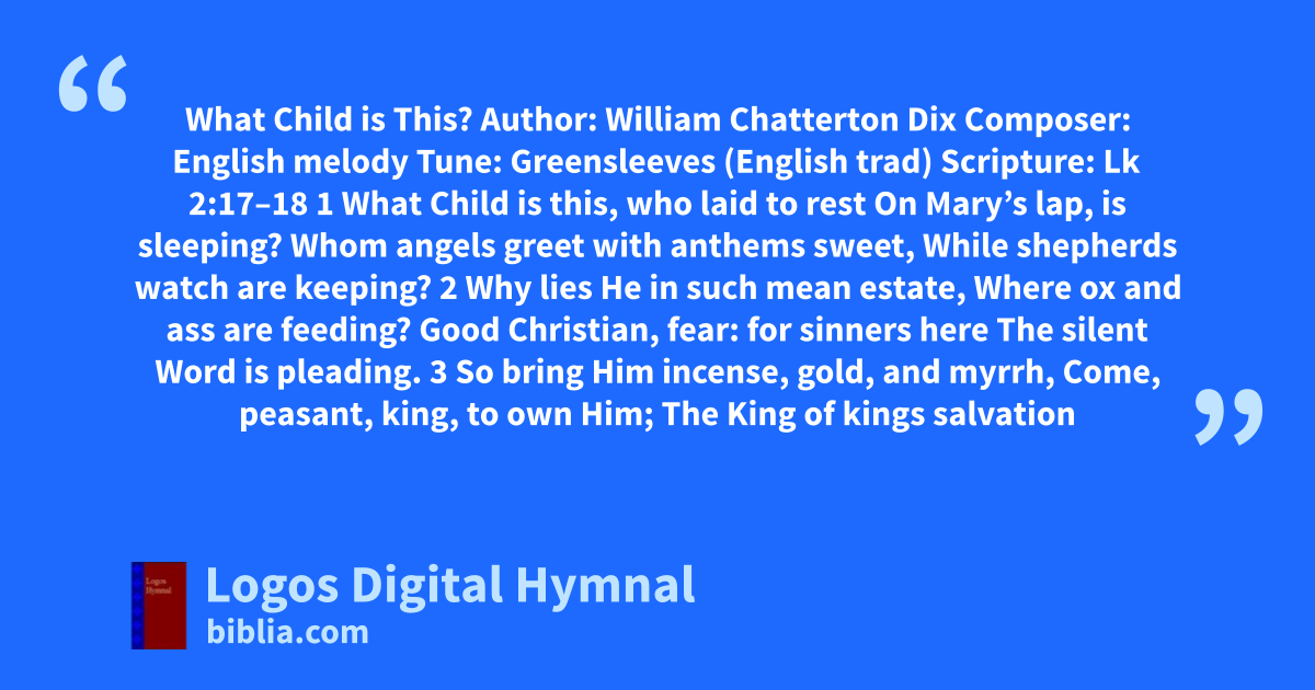 What Child is This? Author: William Chatterton Dix Composer: English melody Tune: Greensleeves (English trad) Scripture: Lk 2:17–18 1 What Child is this, who laid to rest On Mary’s lap, is sleeping? Whom angels greet with anthems sweet, While shepherds watch are keeping? 2 Why lies He in such mean estate, Where ox and ass are feeding? Good Christian, fear: for sinners here The silent Word is pleading. 3 So bring Him incense, gold, and myrrh, Come, peasant, king, to own Him; The King of kings salvation