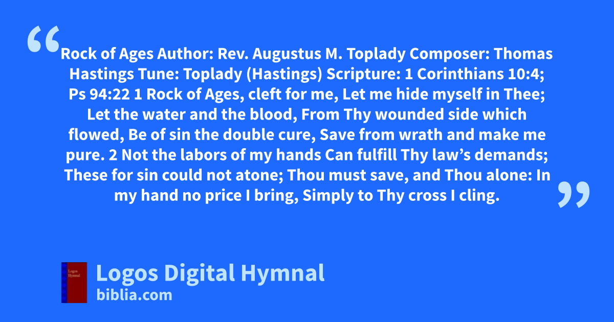 Rock of Ages Author: Rev. Augustus M. Toplady Composer: Thomas Hastings Tune: Toplady (Hastings) Scripture: 1 Corinthians 10:4; Ps 94:22 1 Rock of Ages, cleft for me, Let me hide myself in Thee; Let the water and the blood, From Thy wounded side which flowed, Be of sin the double cure, Save from wrath and make me pure. 2 Not the labors of my hands Can fulfill Thy law’s demands; These for sin could not atone; Thou must save, and Thou alone: In my hand no price I bring, Simply to Thy cross I cling.