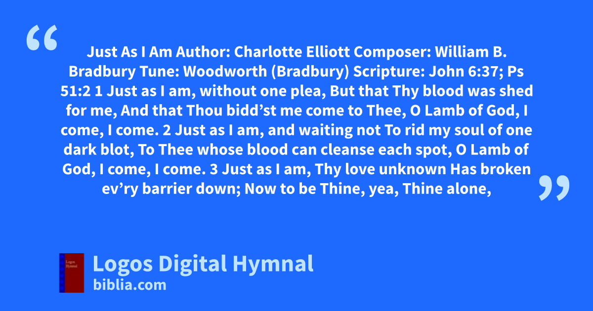 Just As I Am Author: Charlotte Elliott Composer: William B. Bradbury Tune: Woodworth (Bradbury) Scripture: John 6:37; Ps 51:2 1 Just as I am, without one plea, But that Thy blood was shed for me, And that Thou bidd’st me come to Thee, O Lamb of God, I come, I come. 2 Just as I am, and waiting not To rid my soul of one dark blot, To Thee whose blood can cleanse each spot, O Lamb of God, I come, I come. 3 Just as I am, Thy love unknown Has broken ev’ry barrier down; Now to be Thine, yea, Thine alone,