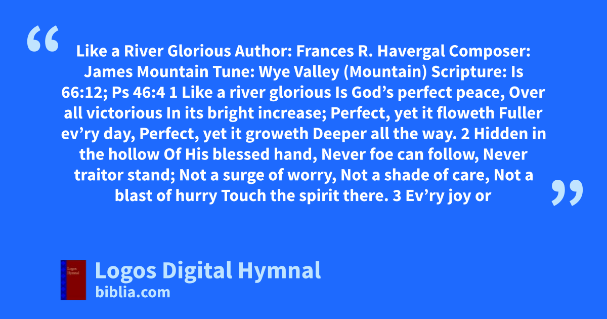 Like a River Glorious Author: Frances R. Havergal Composer: James Mountain Tune: Wye Valley (Mountain) Scripture: Is 66:12; Ps 46:4 1 Like a river glorious Is God’s perfect peace, Over all victorious In its bright increase; Perfect, yet it floweth Fuller ev’ry day, Perfect, yet it groweth Deeper all the way. 2 Hidden in the hollow Of His blessed hand, Never foe can follow, Never traitor stand; Not a surge of worry, Not a shade of care, Not a blast of hurry Touch the spirit there. 3 Ev’ry joy or