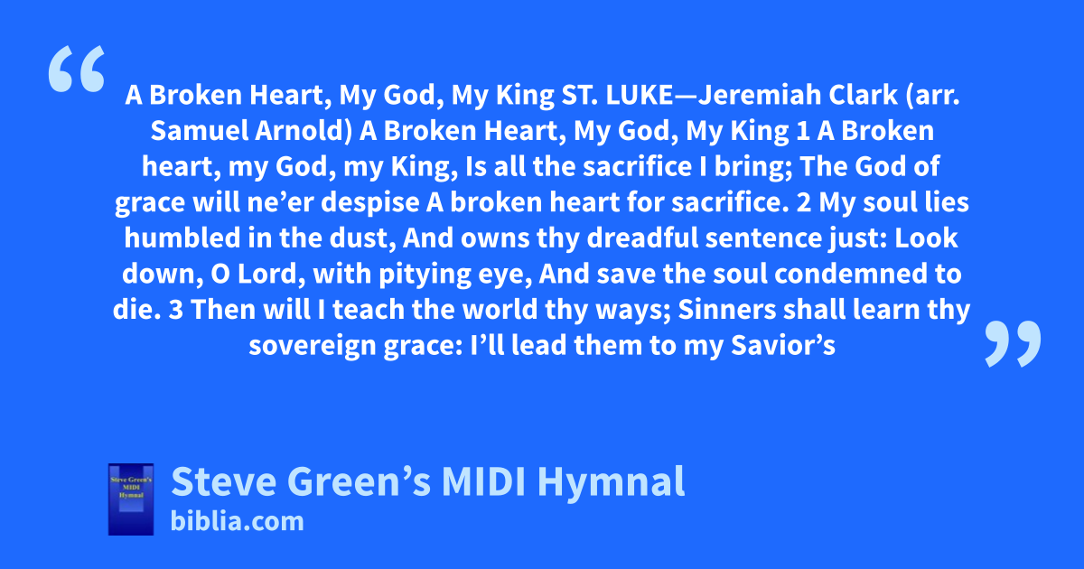 A Broken Heart, My God, My King ST. LUKE—Jeremiah Clark (arr. Samuel Arnold) A Broken Heart, My God, My King 1 A Broken heart, my God, my King, Is all the sacrifice I bring; The God of grace will ne’er despise A broken heart for sacrifice. 2 My soul lies humbled in the dust, And owns thy dreadful sentence just: Look down, O Lord, with pitying eye, And save the soul condemned to die. 3 Then will I teach the world thy ways; Sinners shall learn thy sovereign grace: I’ll lead them to my Savior’s