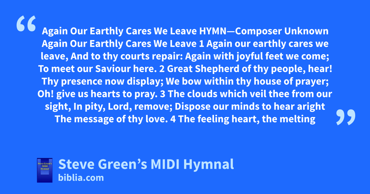 Again Our Earthly Cares We Leave HYMN—Composer Unknown Again Our Earthly Cares We Leave 1 Again our earthly cares we leave, And to thy courts repair: Again with joyful feet we come; To meet our Saviour here. 2 Great Shepherd of thy people, hear! Thy presence now display; We bow within thy house of prayer; Oh! give us hearts to pray. 3 The clouds which veil thee from our sight, In pity, Lord, remove; Dispose our minds to hear aright The message of thy love. 4 The feeling heart, the melting