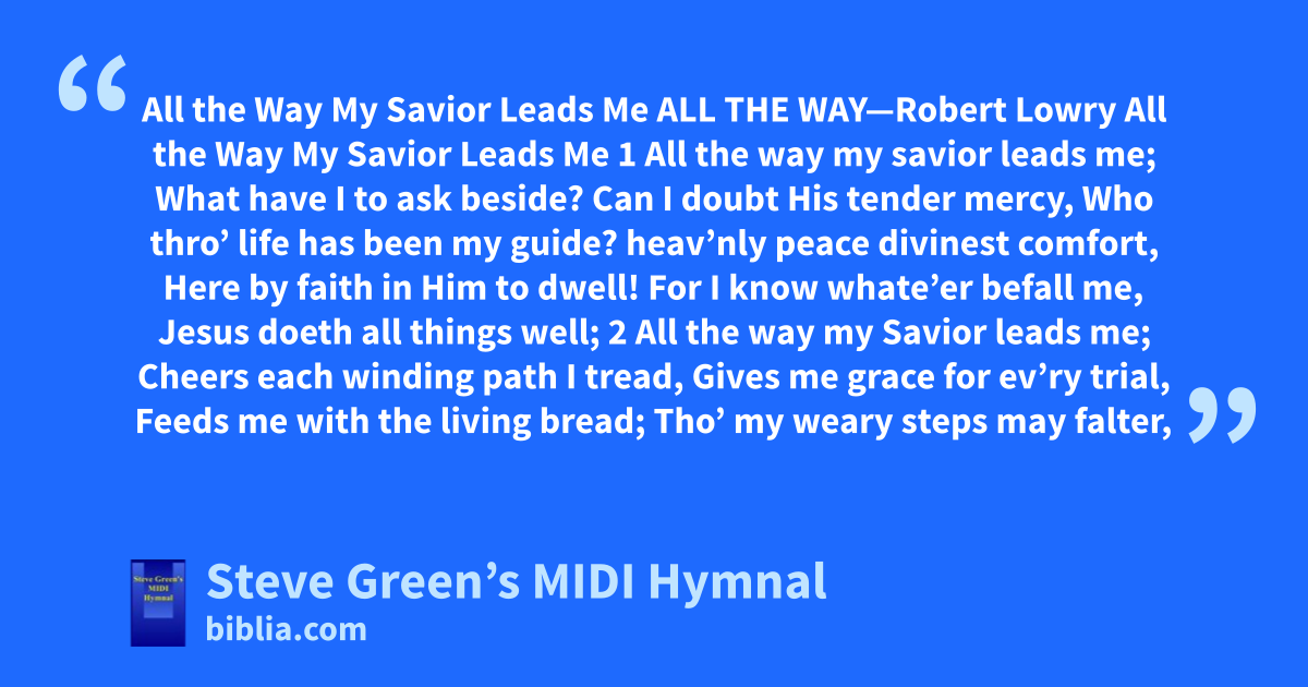 All the Way My Savior Leads Me ALL THE WAY—Robert Lowry All the Way My Savior Leads Me 1 All the way my savior leads me; What have I to ask beside? Can I doubt His tender mercy, Who thro’ life has been my guide? heav’nly peace divinest comfort, Here by faith in Him to dwell! For I know whate’er befall me, Jesus doeth all things well; 2 All the way my Savior leads me; Cheers each winding path I tread, Gives me grace for ev’ry trial, Feeds me with the living bread; Tho’ my weary steps may falter,
