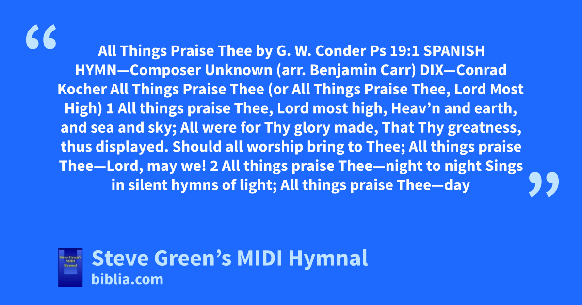 All Things Praise Thee by G. W. Conder Ps 19:1 SPANISH HYMN—Composer Unknown (arr. Benjamin Carr) DIX—Conrad Kocher All Things Praise Thee (or All Things Praise Thee, Lord Most High) 1 All things praise Thee, Lord most high, Heav’n and earth, and sea and sky; All were for Thy glory made, That Thy greatness, thus displayed. Should all worship bring to Thee; All things praise Thee—Lord, may we! 2 All things praise Thee—night to night Sings in silent hymns of light; All things praise Thee—day