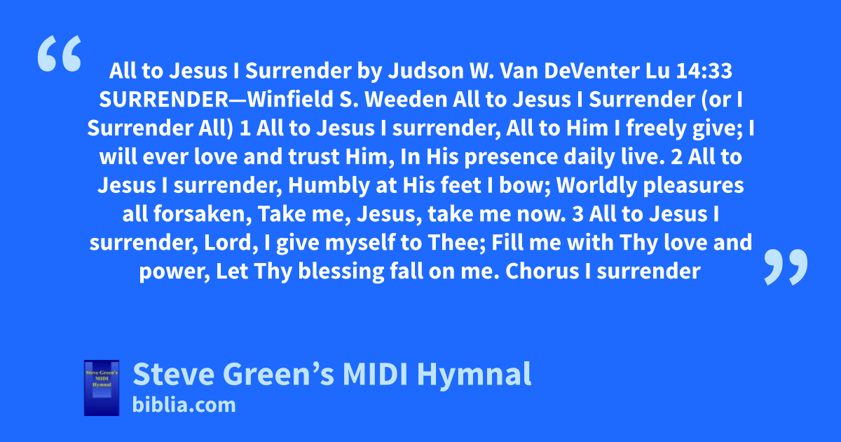 All to Jesus I Surrender by Judson W. Van DeVenter Lu 14:33 SURRENDER—Winfield S. Weeden All to Jesus I Surrender (or I Surrender All) 1 All to Jesus I surrender, All to Him I freely give; I will ever love and trust Him, In His presence daily live. 2 All to Jesus I surrender, Humbly at His feet I bow; Worldly pleasures all forsaken, Take me, Jesus, take me now. 3 All to Jesus I surrender, Lord, I give myself to Thee; Fill me with Thy love and power, Let Thy blessing fall on me. Chorus I surrender