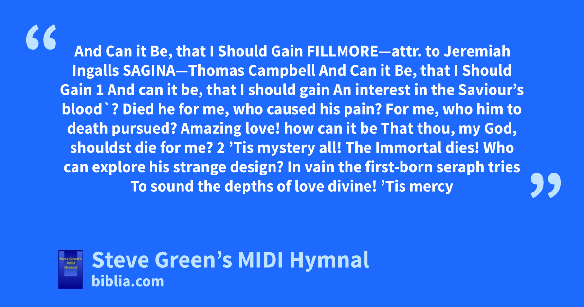 And Can it Be, that I Should Gain FILLMORE—attr. to Jeremiah Ingalls SAGINA—Thomas Campbell And Can it Be, that I Should Gain 1 And can it be, that I should gain An interest in the Saviour’s blood`? Died he for me, who caused his pain? For me, who him to death pursued? Amazing love! how can it be That thou, my God, shouldst die for me? 2 ’Tis mystery all! The Immortal dies! Who can explore his strange design? In vain the first-born seraph tries To sound the depths of love divine! ’Tis mercy