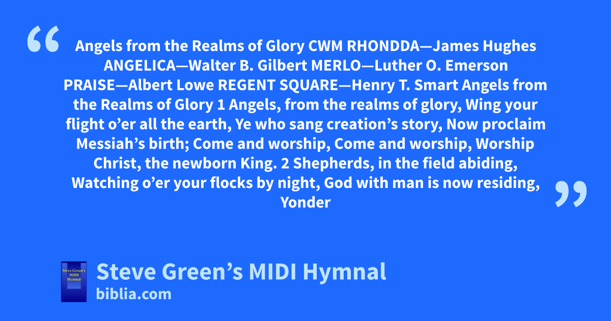 Angels from the Realms of Glory CWM RHONDDA—James Hughes ANGELICA—Walter B. Gilbert MERLO—Luther O. Emerson PRAISE—Albert Lowe REGENT SQUARE—Henry T. Smart Angels from the Realms of Glory 1 Angels, from the realms of glory, Wing your flight o’er all the earth, Ye who sang creation’s story, Now proclaim Messiah’s birth; Come and worship, Come and worship, Worship Christ, the newborn King. 2 Shepherds, in the field abiding, Watching o’er your flocks by night, God with man is now residing, Yonder