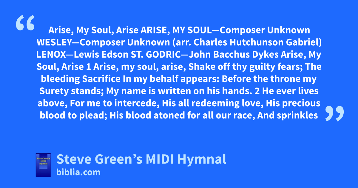 Arise, My Soul, Arise ARISE, MY SOUL—Composer Unknown WESLEY—Composer Unknown (arr. Charles Hutchunson Gabriel) LENOX—Lewis Edson ST. GODRIC—John Bacchus Dykes Arise, My Soul, Arise 1 Arise, my soul, arise, Shake off thy guilty fears; The bleeding Sacrifice In my behalf appears: Before the throne my Surety stands; My name is written on his hands. 2 He ever lives above, For me to intercede, His all redeeming love, His precious blood to plead; His blood atoned for all our race, And sprinkles