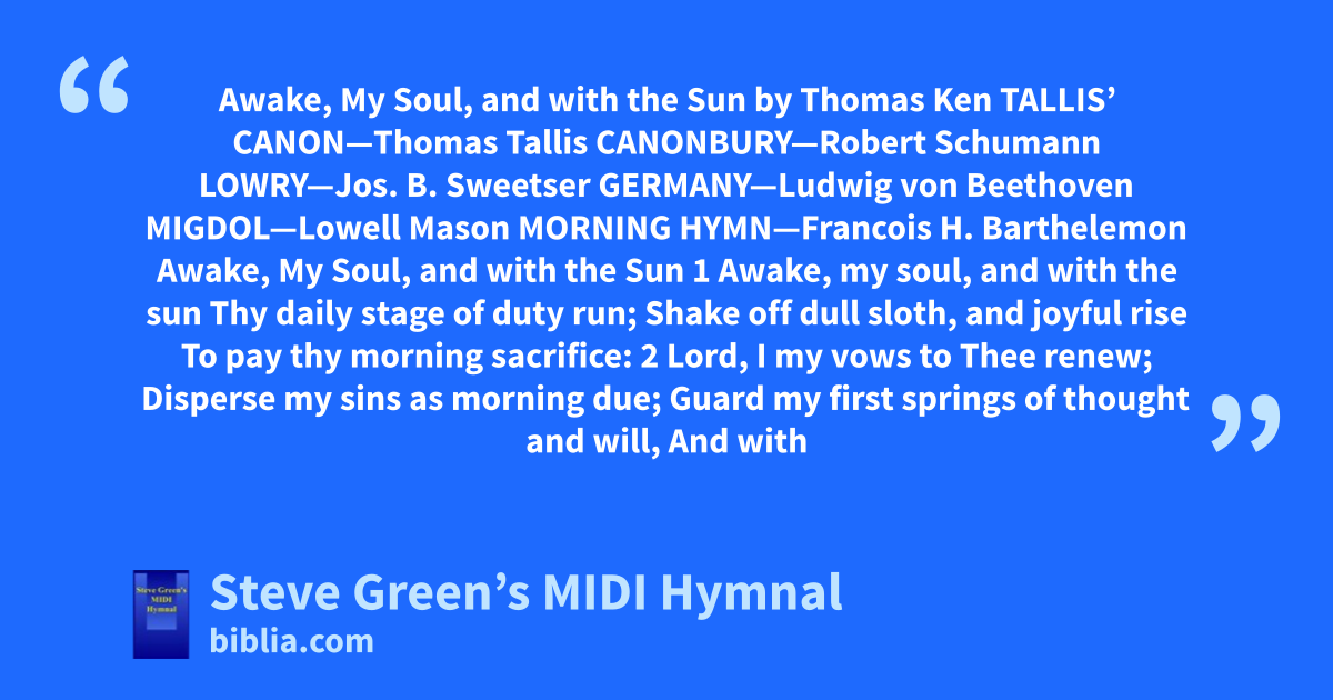 Awake, My Soul, and with the Sun by Thomas Ken TALLIS’ CANON—Thomas Tallis CANONBURY—Robert Schumann LOWRY—Jos. B. Sweetser GERMANY—Ludwig von Beethoven MIGDOL—Lowell Mason MORNING HYMN—Francois H. Barthelemon Awake, My Soul, and with the Sun 1 Awake, my soul, and with the sun Thy daily stage of duty run; Shake off dull sloth, and joyful rise To pay thy morning sacrifice: 2 Lord, I my vows to Thee renew; Disperse my sins as morning due; Guard my first springs of thought and will, And with