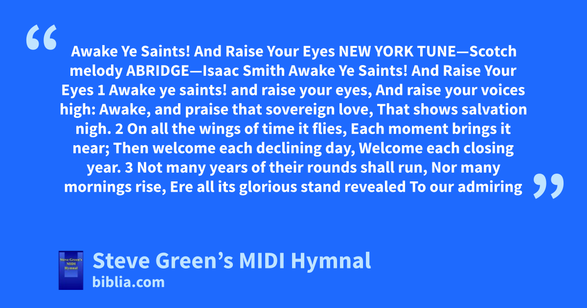 Awake Ye Saints! And Raise Your Eyes NEW YORK TUNE—Scotch melody ABRIDGE—Isaac Smith Awake Ye Saints! And Raise Your Eyes 1 Awake ye saints! and raise your eyes, And raise your voices high: Awake, and praise that sovereign love, That shows salvation nigh. 2 On all the wings of time it flies, Each moment brings it near; Then welcome each declining day, Welcome each closing year. 3 Not many years of their rounds shall run, Nor many mornings rise, Ere all its glorious stand revealed To our admiring