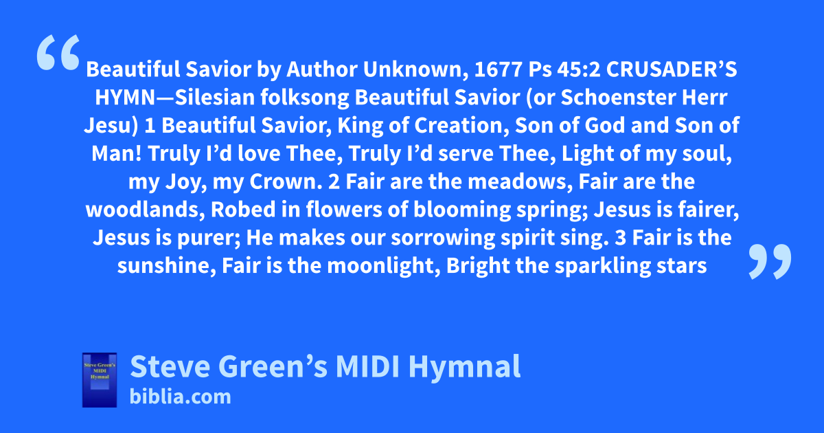 Beautiful Savior by Author Unknown, 1677 Ps 45:2 CRUSADER’S HYMN—Silesian folksong Beautiful Savior (or Schoenster Herr Jesu) 1 Beautiful Savior, King of Creation, Son of God and Son of Man! Truly I’d love Thee, Truly I’d serve Thee, Light of my soul, my Joy, my Crown. 2 Fair are the meadows, Fair are the woodlands, Robed in flowers of blooming spring; Jesus is fairer, Jesus is purer; He makes our sorrowing spirit sing. 3 Fair is the sunshine, Fair is the moonlight, Bright the sparkling stars