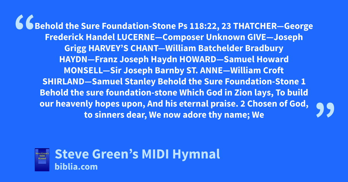 Behold the Sure Foundation-Stone Ps 118:22, 23 THATCHER—George Frederick Handel LUCERNE—Composer Unknown GIVE—Joseph Grigg HARVEY’S CHANT—William Batchelder Bradbury HAYDN—Franz Joseph Haydn HOWARD—Samuel Howard MONSELL—Sir Joseph Barnby ST. ANNE—William Croft SHIRLAND—Samuel Stanley Behold the Sure Foundation-Stone 1 Behold the sure foundation-stone Which God in Zion lays, To build our heavenly hopes upon, And his eternal praise. 2 Chosen of God, to sinners dear, We now adore thy name; We
