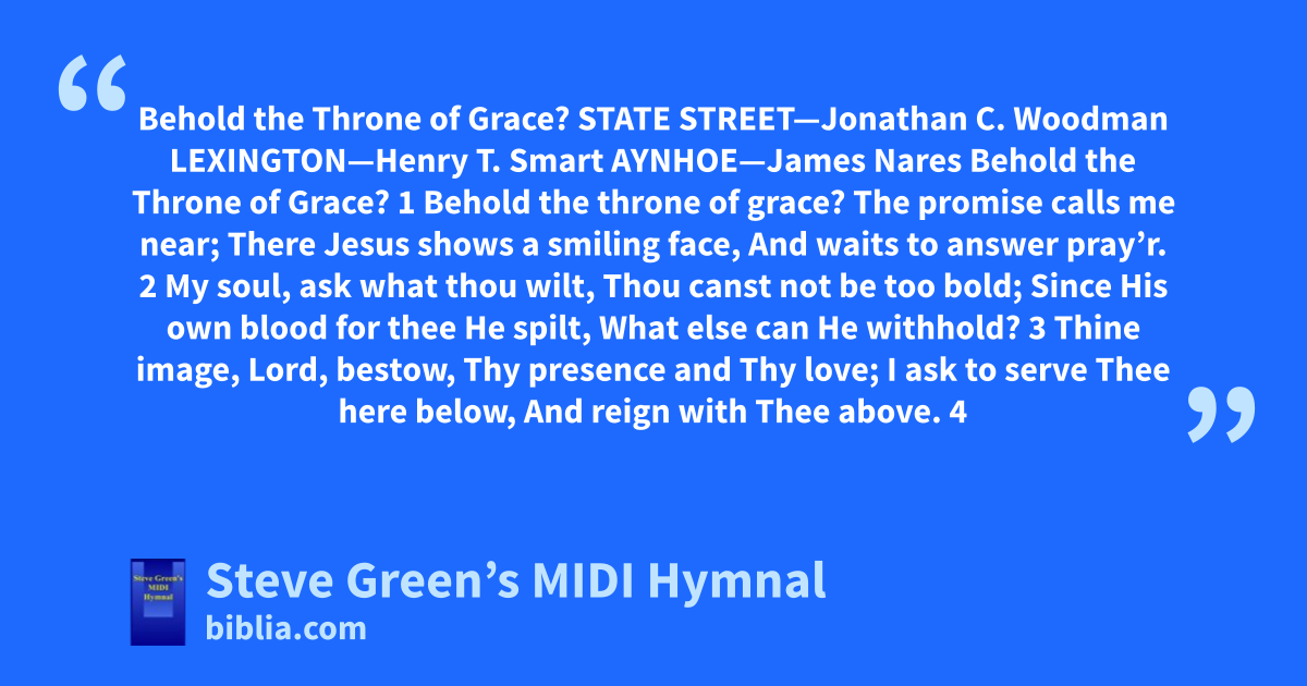 Behold the Throne of Grace? STATE STREET—Jonathan C. Woodman LEXINGTON—Henry T. Smart AYNHOE—James Nares Behold the Throne of Grace? 1 Behold the throne of grace? The promise calls me near; There Jesus shows a smiling face, And waits to answer pray’r. 2 My soul, ask what thou wilt, Thou canst not be too bold; Since His own blood for thee He spilt, What else can He withhold? 3 Thine image, Lord, bestow, Thy presence and Thy love; I ask to serve Thee here below, And reign with Thee above. 4