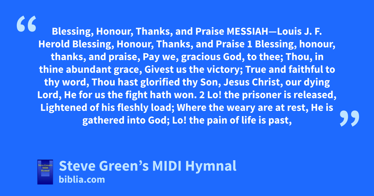 Blessing, Honour, Thanks, and Praise MESSIAH—Louis J. F. Herold Blessing, Honour, Thanks, and Praise 1 Blessing, honour, thanks, and praise, Pay we, gracious God, to thee; Thou, in thine abundant grace, Givest us the victory; True and faithful to thy word, Thou hast glorified thy Son, Jesus Christ, our dying Lord, He for us the fight hath won. 2 Lo! the prisoner is released, Lightened of his fleshly load; Where the weary are at rest, He is gathered into God; Lo! the pain of life is past,