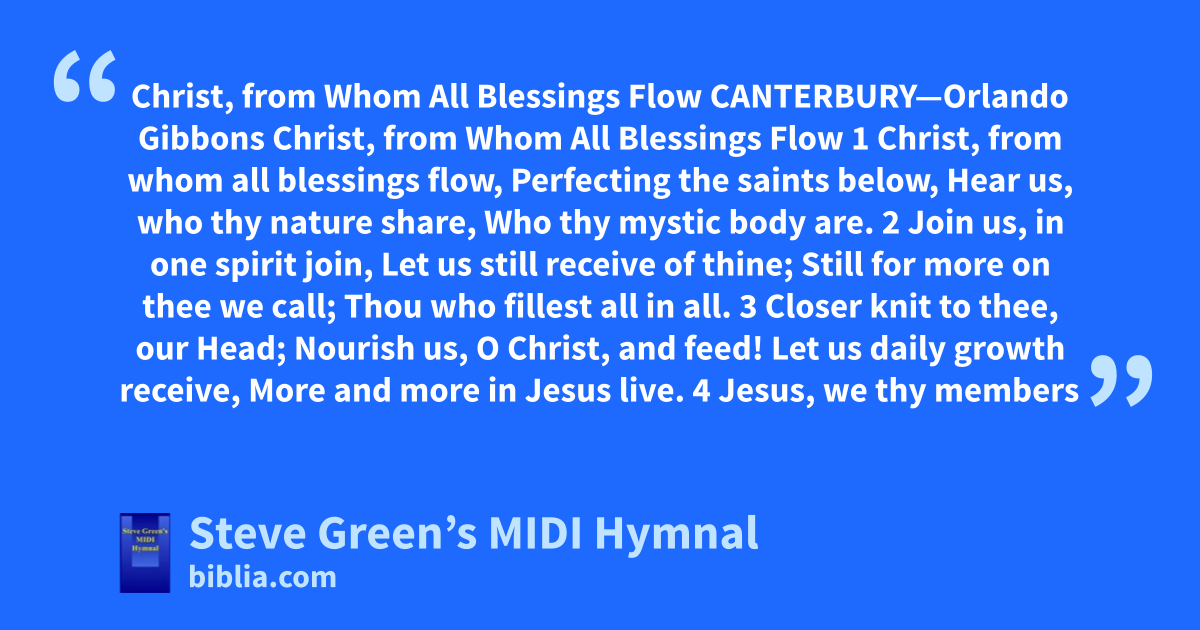 Christ, from Whom All Blessings Flow CANTERBURY—Orlando Gibbons Christ, from Whom All Blessings Flow 1 Christ, from whom all blessings flow, Perfecting the saints below, Hear us, who thy nature share, Who thy mystic body are. 2 Join us, in one spirit join, Let us still receive of thine; Still for more on thee we call; Thou who fillest all in all. 3 Closer knit to thee, our Head; Nourish us, O Christ, and feed! Let us daily growth receive, More and more in Jesus live. 4 Jesus, we thy members