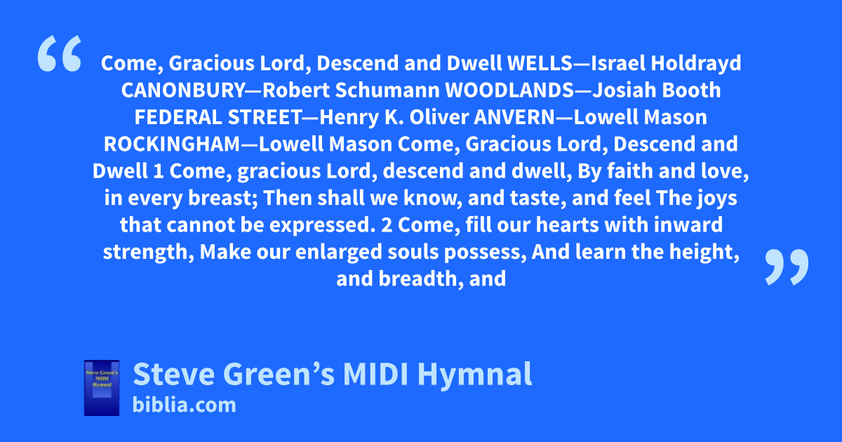 Come, Gracious Lord, Descend and Dwell WELLS—Israel Holdrayd CANONBURY—Robert Schumann WOODLANDS—Josiah Booth FEDERAL STREET—Henry K. Oliver ANVERN—Lowell Mason ROCKINGHAM—Lowell Mason Come, Gracious Lord, Descend and Dwell 1 Come, gracious Lord, descend and dwell, By faith and love, in every breast; Then shall we know, and taste, and feel The joys that cannot be expressed. 2 Come, fill our hearts with inward strength, Make our enlarged souls possess, And learn the height, and breadth, and
