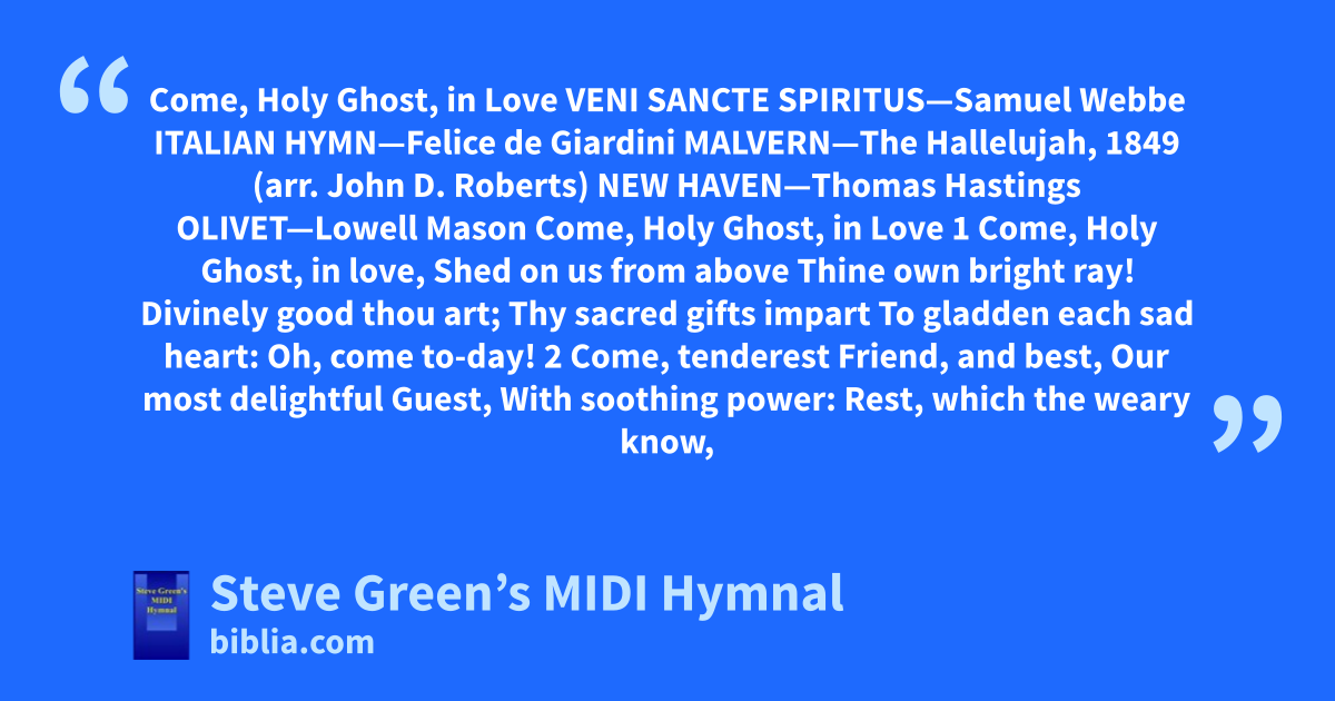 Come, Holy Ghost, in Love VENI SANCTE SPIRITUS—Samuel Webbe ITALIAN HYMN—Felice de Giardini MALVERN—The Hallelujah, 1849 (arr. John D. Roberts) NEW HAVEN—Thomas Hastings OLIVET—Lowell Mason Come, Holy Ghost, in Love 1 Come, Holy Ghost, in love, Shed on us from above Thine own bright ray! Divinely good thou art; Thy sacred gifts impart To gladden each sad heart: Oh, come to-day! 2 Come, tenderest Friend, and best, Our most delightful Guest, With soothing power: Rest, which the weary know,