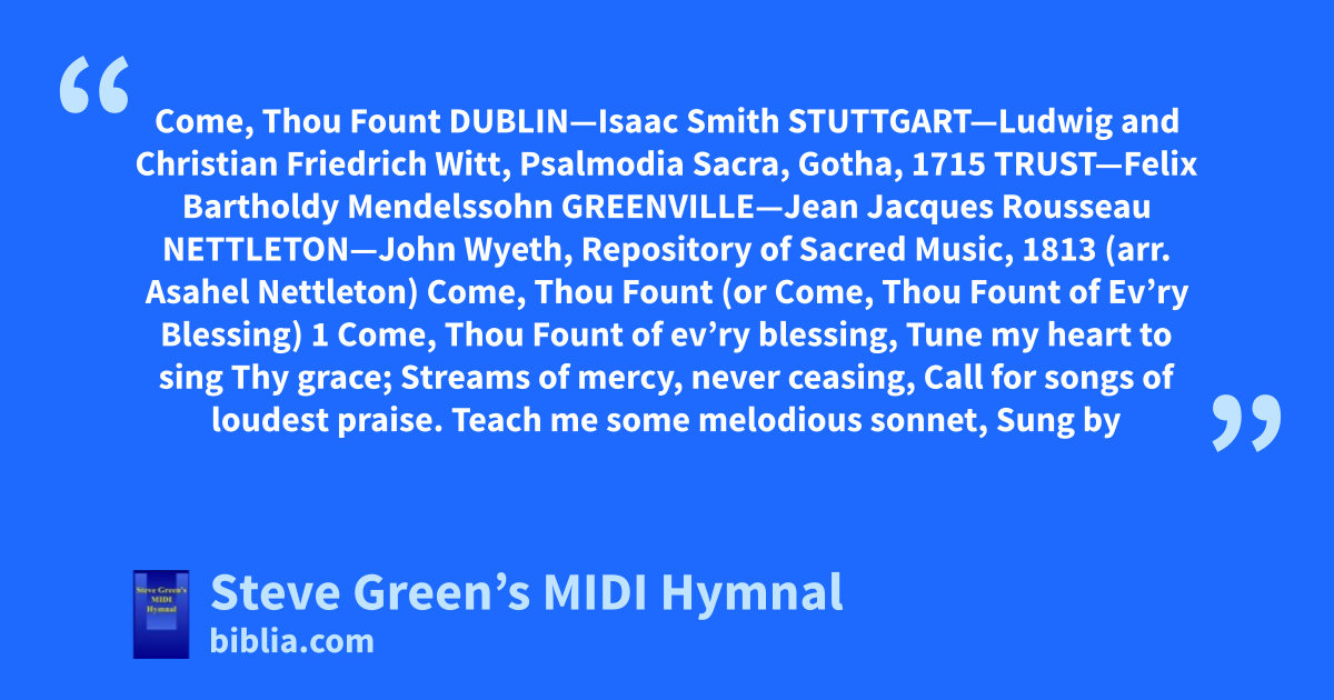Come, Thou Fount DUBLIN—Isaac Smith STUTTGART—Ludwig and Christian Friedrich Witt, Psalmodia Sacra, Gotha, 1715 TRUST—Felix Bartholdy Mendelssohn GREENVILLE—Jean Jacques Rousseau NETTLETON—John Wyeth, Repository of Sacred Music, 1813 (arr. Asahel Nettleton) Come, Thou Fount (or Come, Thou Fount of Ev’ry Blessing) 1 Come, Thou Fount of ev’ry blessing, Tune my heart to sing Thy grace; Streams of mercy, never ceasing, Call for songs of loudest praise. Teach me some melodious sonnet, Sung by