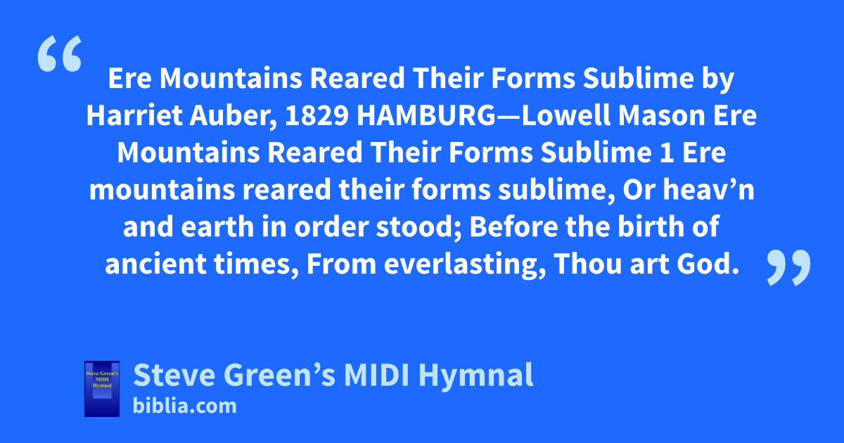 Ere Mountains Reared Their Forms Sublime by Harriet Auber, 1829 HAMBURG—Lowell Mason Ere Mountains Reared Their Forms Sublime 1 Ere mountains reared their forms sublime, Or heav’n and earth in order stood; Before the birth of ancient times, From everlasting, Thou art God.