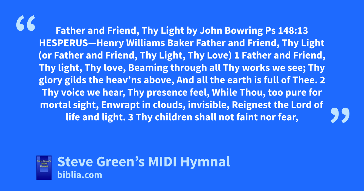 Father and Friend, Thy Light by John Bowring Ps 148:13 HESPERUS—Henry Williams Baker Father and Friend, Thy Light (or Father and Friend, Thy Light, Thy Love) 1 Father and Friend, Thy light, Thy love, Beaming through all Thy works we see; Thy glory gilds the heav’ns above, And all the earth is full of Thee. 2 Thy voice we hear, Thy presence feel, While Thou, too pure for mortal sight, Enwrapt in clouds, invisible, Reignest the Lord of life and light. 3 Thy children shall not faint nor fear,