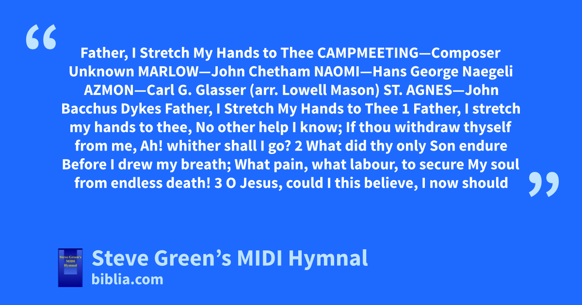 Father, I Stretch My Hands to Thee CAMPMEETING—Composer Unknown MARLOW—John Chetham NAOMI—Hans George Naegeli AZMON—Carl G. Glasser (arr. Lowell Mason) ST. AGNES—John Bacchus Dykes Father, I Stretch My Hands to Thee 1 Father, I stretch my hands to thee, No other help I know; If thou withdraw thyself from me, Ah! whither shall I go? 2 What did thy only Son endure Before I drew my breath; What pain, what labour, to secure My soul from endless death! 3 O Jesus, could I this believe, I now should