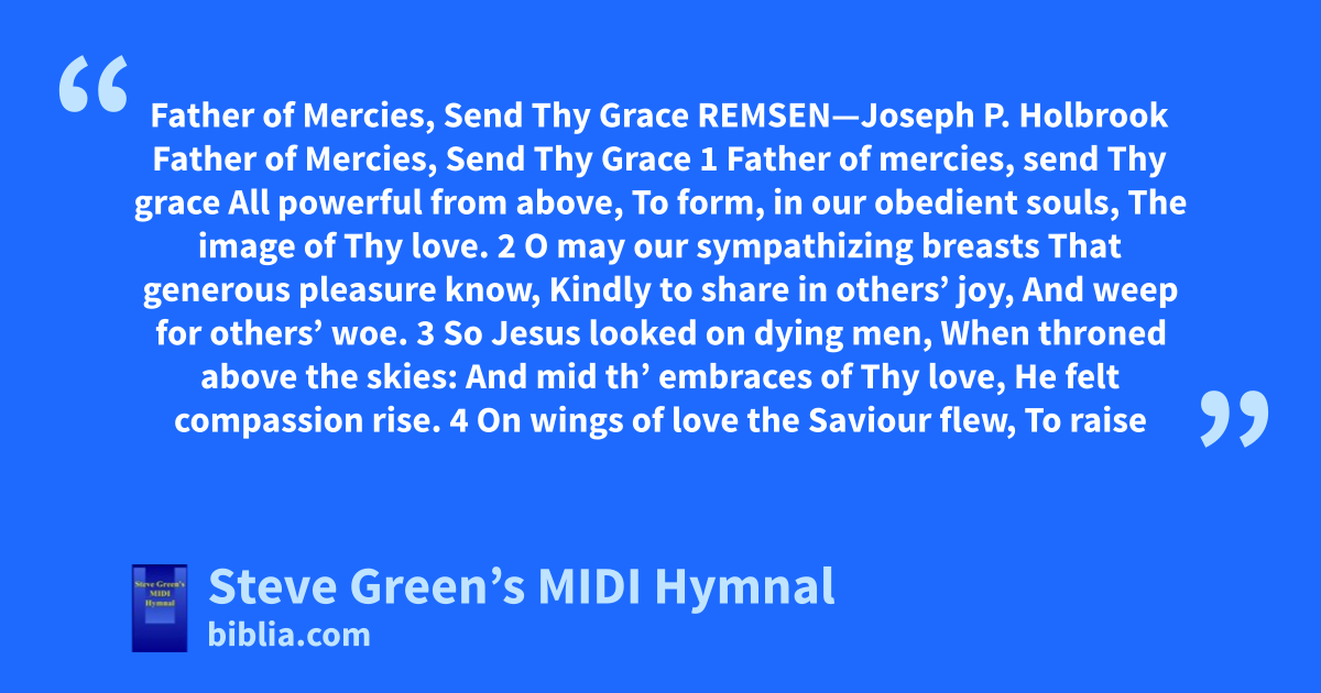 Father of Mercies, Send Thy Grace REMSEN—Joseph P. Holbrook Father of Mercies, Send Thy Grace 1 Father of mercies, send Thy grace All powerful from above, To form, in our obedient souls, The image of Thy love. 2 O may our sympathizing breasts That generous pleasure know, Kindly to share in others’ joy, And weep for others’ woe. 3 So Jesus looked on dying men, When throned above the skies: And mid th’ embraces of Thy love, He felt compassion rise. 4 On wings of love the Saviour flew, To raise