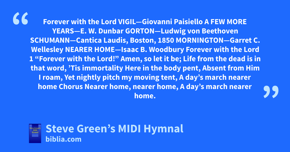 Forever with the Lord VIGIL—Giovanni Paisiello A FEW MORE YEARS—E. W. Dunbar GORTON—Ludwig von Beethoven SCHUMANN—Cantica Laudis, Boston, 1850 MORNINGTON—Garret C. Wellesley NEARER HOME—Isaac B. Woodbury Forever with the Lord 1 “Forever with the Lord!” Amen, so let it be; Life from the dead is in that word, ’Tis immortality Here in the body pent, Absent from Him I roam, Yet nightly pitch my moving tent, A day’s march nearer home Chorus Nearer home, nearer home, A day’s march nearer home.