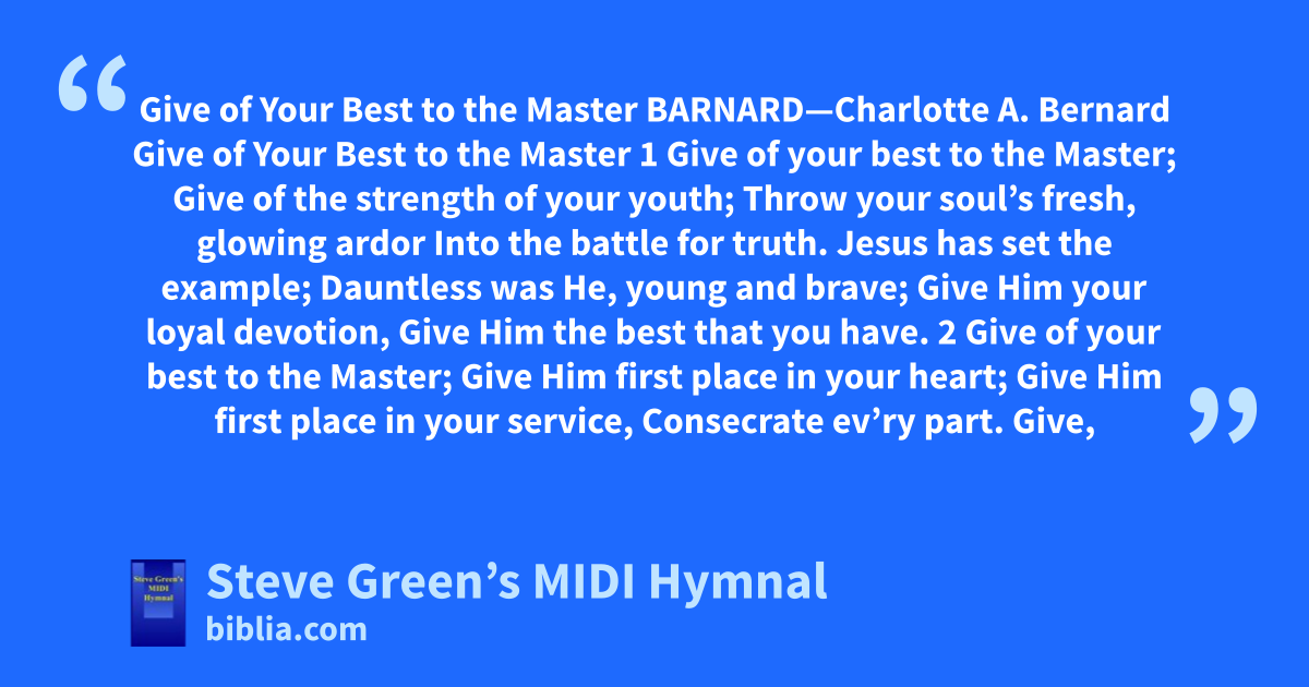 Give of Your Best to the Master BARNARD—Charlotte A. Bernard Give of Your Best to the Master 1 Give of your best to the Master; Give of the strength of your youth; Throw your soul’s fresh, glowing ardor Into the battle for truth. Jesus has set the example; Dauntless was He, young and brave; Give Him your loyal devotion, Give Him the best that you have. 2 Give of your best to the Master; Give Him first place in your heart; Give Him first place in your service, Consecrate ev’ry part. Give,