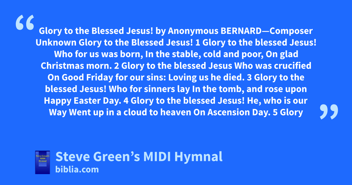 Glory to the Blessed Jesus! by Anonymous BERNARD—Composer Unknown Glory to the Blessed Jesus! 1 Glory to the blessed Jesus! Who for us was born, In the stable, cold and poor, On glad Christmas morn. 2 Glory to the blessed Jesus Who was crucified On Good Friday for our sins: Loving us he died. 3 Glory to the blessed Jesus! Who for sinners lay In the tomb, and rose upon Happy Easter Day. 4 Glory to the blessed Jesus! He, who is our Way Went up in a cloud to heaven On Ascension Day. 5 Glory