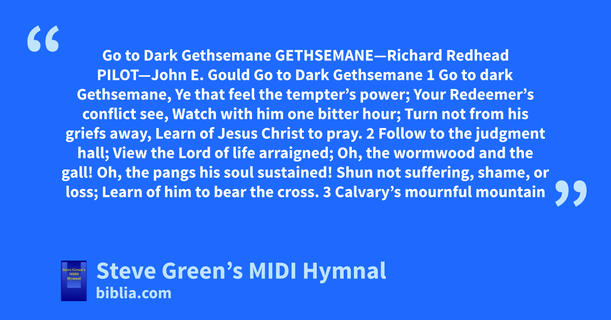 Go to Dark Gethsemane GETHSEMANE—Richard Redhead PILOT—John E. Gould Go to Dark Gethsemane 1 Go to dark Gethsemane, Ye that feel the tempter’s power; Your Redeemer’s conflict see, Watch with him one bitter hour; Turn not from his griefs away, Learn of Jesus Christ to pray. 2 Follow to the judgment hall; View the Lord of life arraigned; Oh, the wormwood and the gall! Oh, the pangs his soul sustained! Shun not suffering, shame, or loss; Learn of him to bear the cross. 3 Calvary’s mournful mountain