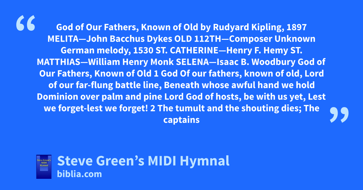 God of Our Fathers, Known of Old by Rudyard Kipling, 1897 MELITA—John Bacchus Dykes OLD 112TH—Composer Unknown German melody, 1530 ST. CATHERINE—Henry F. Hemy ST. MATTHIAS—William Henry Monk SELENA—Isaac B. Woodbury God of Our Fathers, Known of Old 1 God Of our fathers, known of old, Lord of our far-flung battle line, Beneath whose awful hand we hold Dominion over palm and pine Lord God of hosts, be with us yet, Lest we forget-lest we forget! 2 The tumult and the shouting dies; The captains