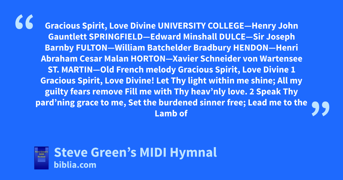 Gracious Spirit, Love Divine UNIVERSITY COLLEGE—Henry John Gauntlett SPRINGFIELD—Edward Minshall DULCE—Sir Joseph Barnby FULTON—William Batchelder Bradbury HENDON—Henri Abraham Cesar Malan HORTON—Xavier Schneider von Wartensee ST. MARTIN—Old French melody Gracious Spirit, Love Divine 1 Gracious Spirit, Love Divine! Let Thy light within me shine; All my guilty fears remove Fill me with Thy heav’nly love. 2 Speak Thy pard’ning grace to me, Set the burdened sinner free; Lead me to the Lamb of