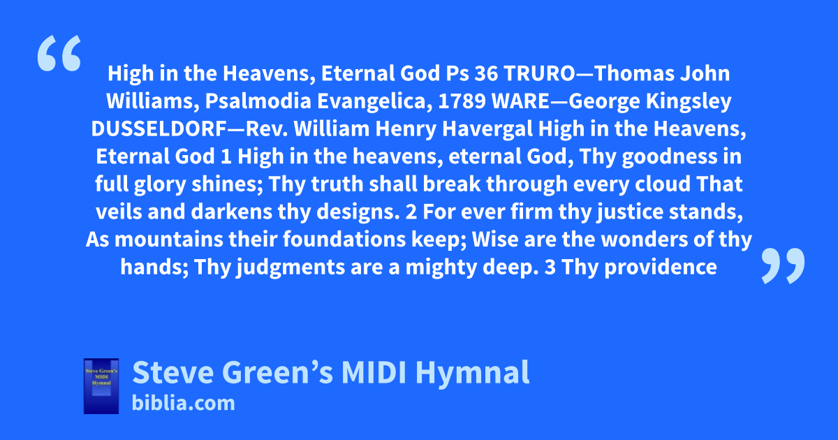 High in the Heavens, Eternal God Ps 36 TRURO—Thomas John Williams, Psalmodia Evangelica, 1789 WARE—George Kingsley DUSSELDORF—Rev. William Henry Havergal High in the Heavens, Eternal God 1 High in the heavens, eternal God, Thy goodness in full glory shines; Thy truth shall break through every cloud That veils and darkens thy designs. 2 For ever firm thy justice stands, As mountains their foundations keep; Wise are the wonders of thy hands; Thy judgments are a mighty deep. 3 Thy providence